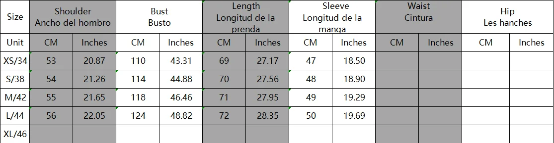 SIZE S:Shoulder:43.5cm,Bust:110cm,Waist:102cm,Sleeve length:56.5cm,Length:72cm M:Shoulder:44.5cm,Bust:114cm,Waist:106cm,Sleeve length:57.5cm,Length:73cm L:Shoulder:45.5cm,Bust:118cm,Waist:110cm,Sleeve length:58.5cm,Length:74cm XL:Shoulder:46.5cm,Bust:122cm,Waist:114cm,Sleeve length:59.5cm,Length:75cm Note: 1 inch = 2.54 cm, 1 cm = 0.39 inch