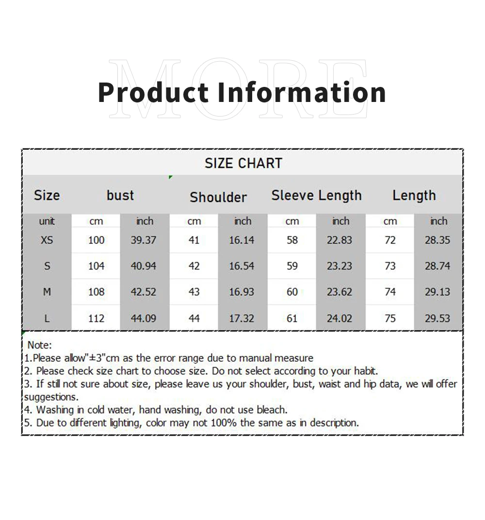 Size S: Shoulder 35cm, Bust 90cm, Length 62cm, Sleeve 57cm Size M: Shoulder 36cm, Bust 94cm, Length 63cm, Sleeve 58cm
